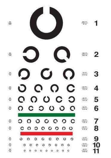 但是,需要說明的是“E表”并不是所有國家都在用。如美國現(xiàn)在還在沿用的“Snellen chart”它是由各種拉丁字母組成的,是最初版本的視力表。日本采用的蘭德特環(huán)行視力表又常被叫做“C表”。C表”也是我國飛行員,招收所所采用的標準。