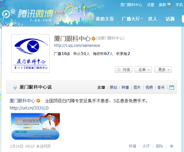 【文章導讀】廈門眼科中心官方微博開通啦!歡迎您加為關注,獲取眼科中心動態(tài)! 新浪微博: http://t.sina.com.cn/ykzx 騰訊微博: http://t.qq.com/xiameneye