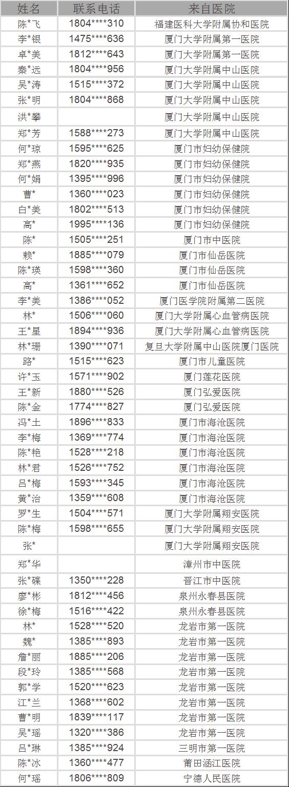 經(jīng)過審核完成后,廈門13家醫(yī)院34名醫(yī)護(hù)人員、福州1家醫(yī)院1名醫(yī)護(hù)人員、漳州1家醫(yī)院1名醫(yī)護(hù)人員、泉州2家醫(yī)院3名醫(yī)護(hù)人員、龍巖1家醫(yī)院8名醫(yī)護(hù)人員、三明1家醫(yī)院1名醫(yī)護(hù)人員、莆田1家醫(yī)院1名醫(yī)護(hù)人員、寧德1家醫(yī)院1名醫(yī)護(hù)人員獲得了免費手術(shù)資格。名單公示如下: