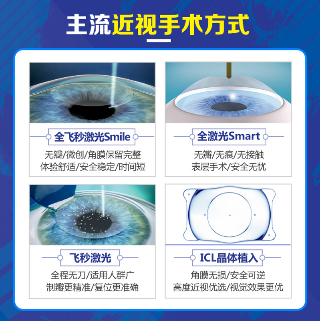 ICL晶體植入術(shù)、全飛秒激光SMILE、全激光SMART及半飛秒激光。