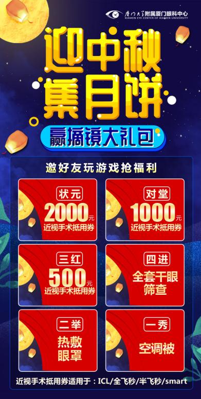 為了使更多的近視朋友輕松享受“無鏡”世界,廈門大學(xué)附屬廈門眼科中心于中秋國慶到來之際,特開展“迎中秋集月餅 贏摘鏡大禮包”的活動(dòng),讓近視的小伙伴可以獲得摘鏡優(yōu)惠和豐厚福利。