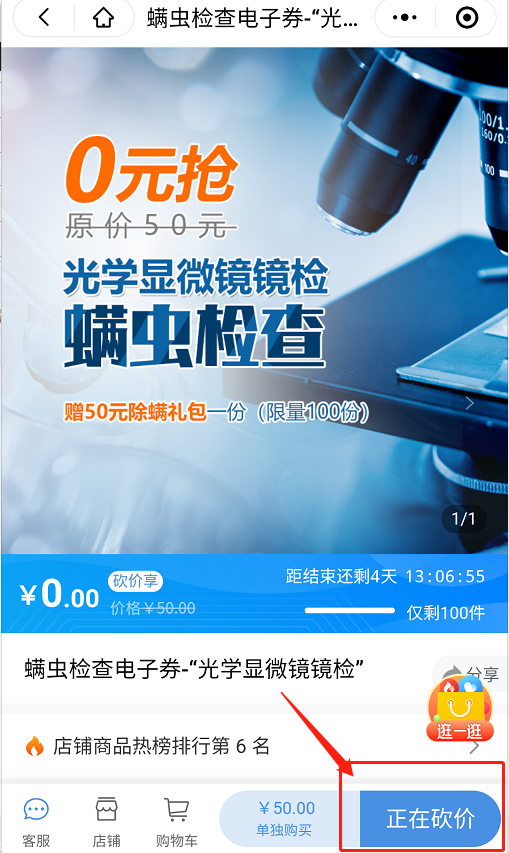 2、邀請10位好友助力砍價,即可0元享螨蟲鏡檢。