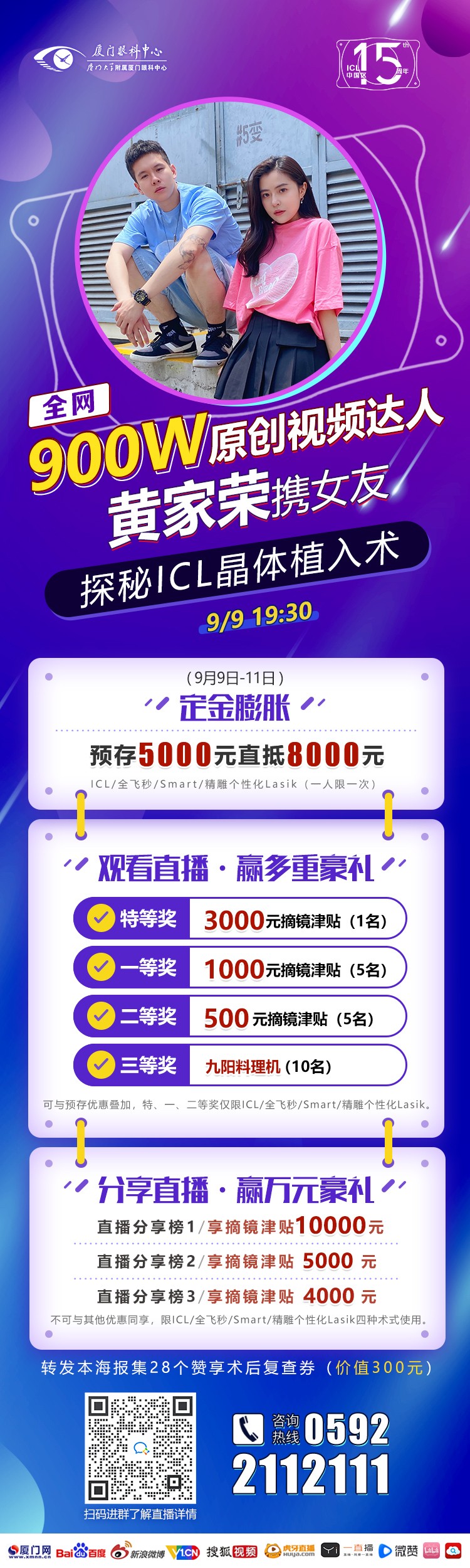所以——摘鏡嗎?摘鏡!9月9日19:30,黃家榮將攜女友小山楂,和廈門眼科中心陳亮副主任一起為大家展示ICL手術(shù)全過程,直播期間,還會(huì)為大家?guī)矶喽嗟恼R福利哦