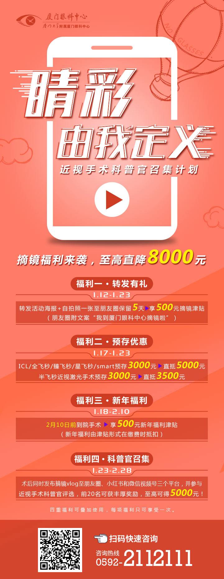 凡在廈門眼科中心摘鏡者,術(shù)后發(fā)布摘鏡vlog至PY圈、小H書和微信視頻號保留2個月,并參與廈門眼科中心近視手術(shù)科普官評選,可獲至高5000元獎勵。