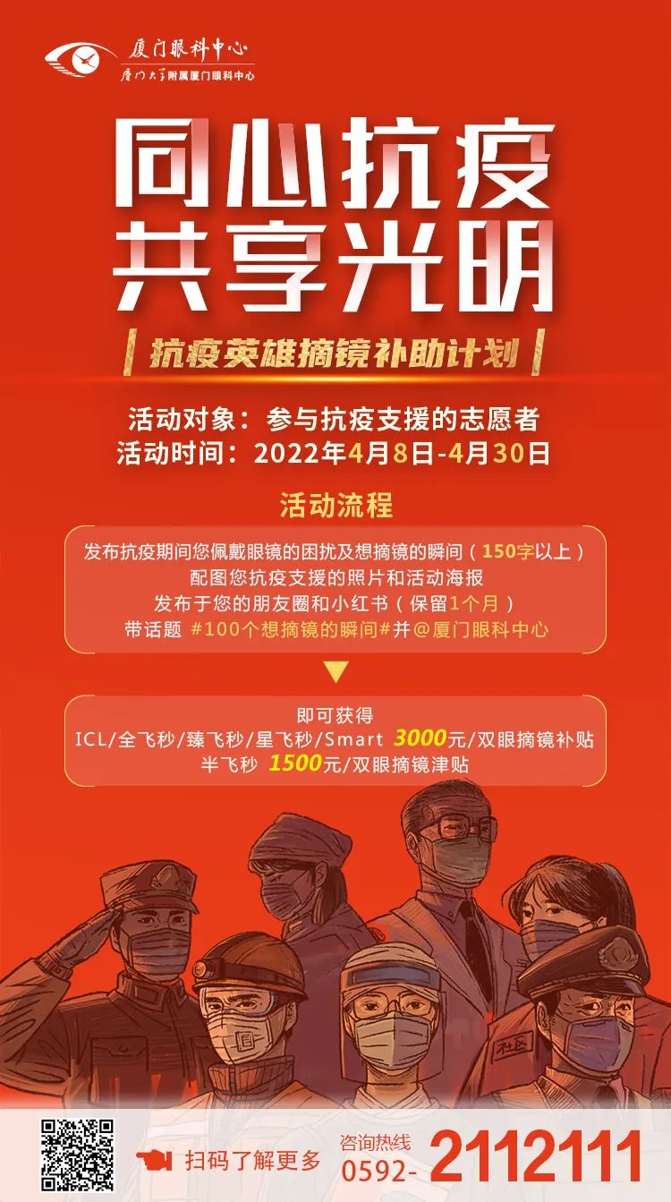 活動(dòng)內(nèi)容 :發(fā)布抗疫期間佩戴眼鏡的困擾及想摘鏡的瞬間(150字以上)發(fā)布于PYQ和小H書(保留1個(gè)月),配圖您抗疫支援的照片(2 張及以上)和本次活動(dòng)海報(bào),帶上話題#100個(gè)想摘鏡的瞬間,并@廈門眼科中心,即可獲得摘鏡補(bǔ)貼。