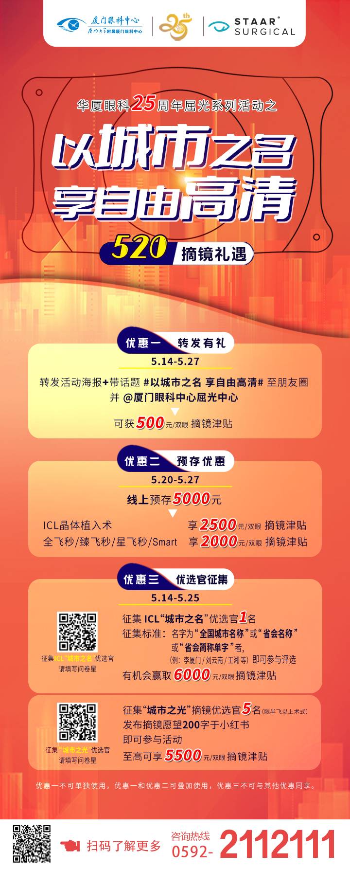 征集“城市之名”ICL優(yōu)選官1名,可享受ICL手術(shù)摘鏡津貼6000元。
