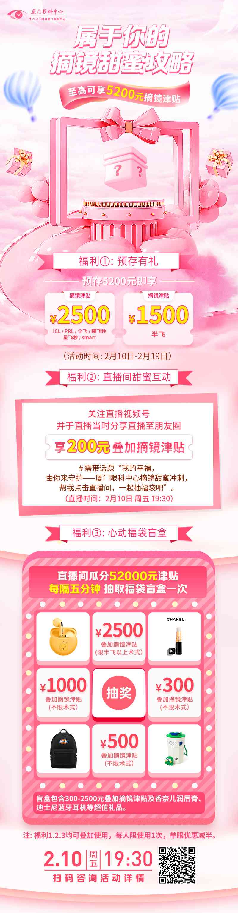觀看直播,并分享直播至朋友圈,帶話題「我的幸福,由你來守護(hù)——廈門眼科中心摘鏡甜蜜沖刺,幫我點(diǎn)擊直播間,一起抽福袋吧」,即享200元疊加摘鏡津貼。