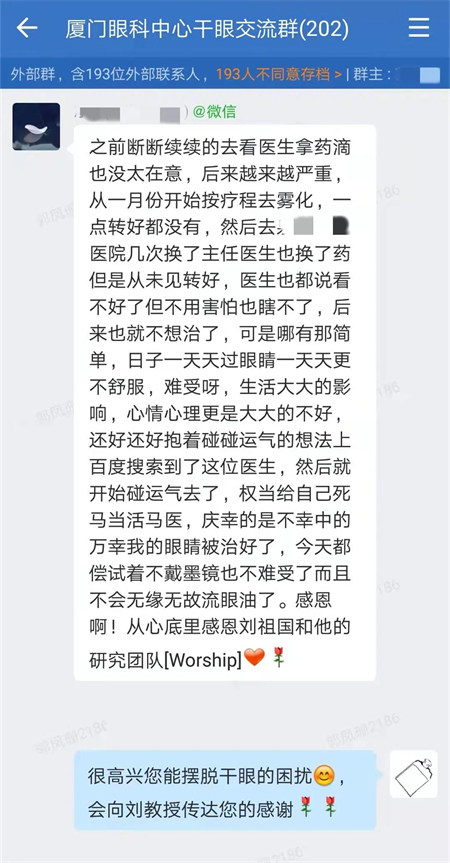 這位干眼患者在群里感謝了她的主治醫(yī)生劉祖國(guó)教授,并聲稱(chēng)醫(yī)生拯救了她的生活。