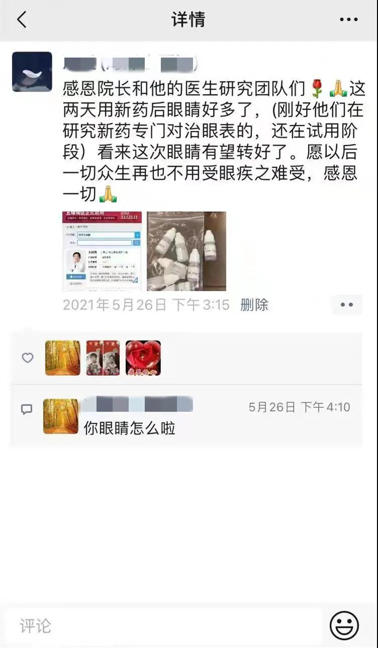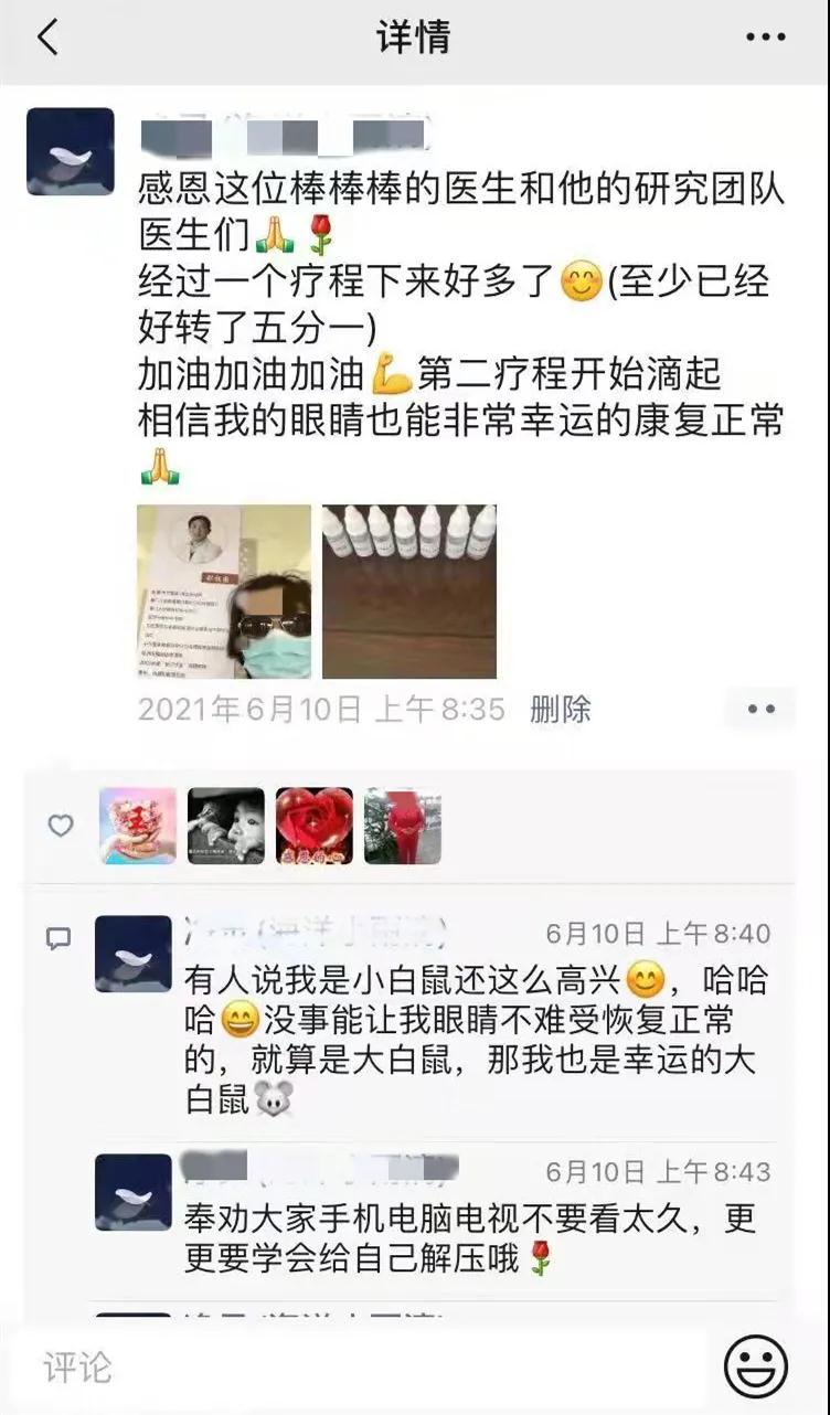 滴用了兩天藥水,小雨明顯感到藥水有在見(jiàn)效,她開(kāi)始每天在朋友圈分享自己的治療進(jìn)度和感受,一個(gè)療程結(jié)束后,她的癥狀得到了明顯的改善。在滴用完兩個(gè)療程,小雨來(lái)找劉祖國(guó)教授復(fù)查,劉教授為她更換新的藥水,開(kāi)始了第三療程的治療。