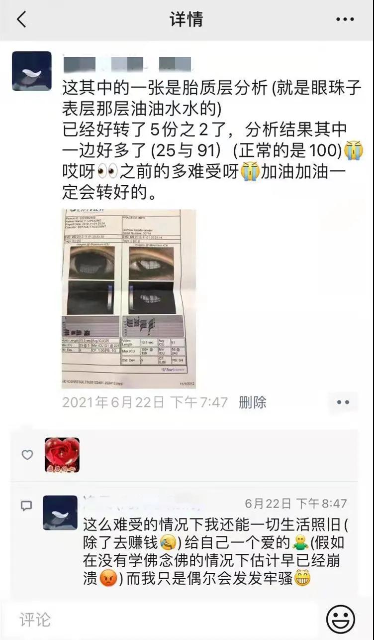 之前干眼癥嚴(yán)重時(shí)有多痛苦,現(xiàn)在就有多幸福,小雨忍不住在群里分享自己的治療經(jīng)歷,想讓其他在治療的朋友堅(jiān)持下去。另外還特別拜托我們,一定要替她向劉祖國(guó)教授表達(dá)感謝,“我真的治了好久,一點(diǎn)好轉(zhuǎn)都沒(méi)有,我自己都想放棄了,是劉教授救了我的生活。”