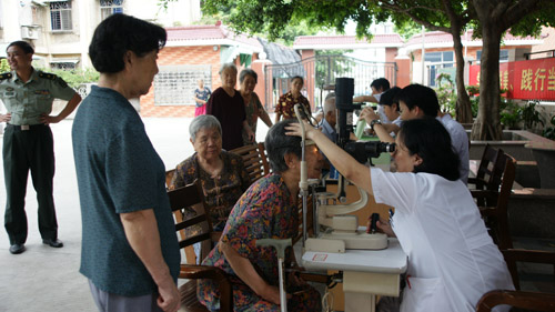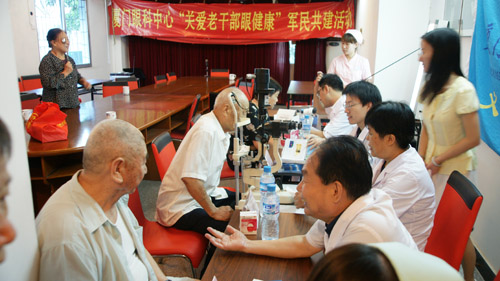 在干休所,眼科專家耐心細(xì)致地為每一位老干部作眼部檢查,向他們講解眼保健知識,進(jìn)行診斷,并發(fā)放藥品。醫(yī)護(hù)人員則熱情地為老人們測量血壓、作視力檢查。為了幫助老人們掌握眼保健知識, 醫(yī)護(hù)人員還專門搜集了眼病常見問題及愛眼護(hù)眼保健知識等,印制成宣傳手冊發(fā)放給老人。