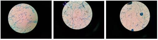 用「乳酸酚棉藍」染色,在顯微鏡下觀察菌絲及孢子可判斷真菌類型。