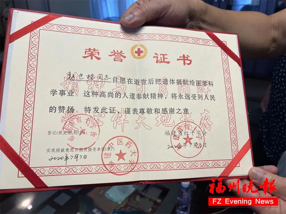 當(dāng)晚9時(shí)多,按照其遺愿,他如愿以償,捐獻(xiàn)有用的器官——眼角膜,并“坐”上開往福建中醫(yī)藥大學(xué)的車子,成為一名大體老師(醫(yī)學(xué)界對遺體捐贈者的尊稱)。
