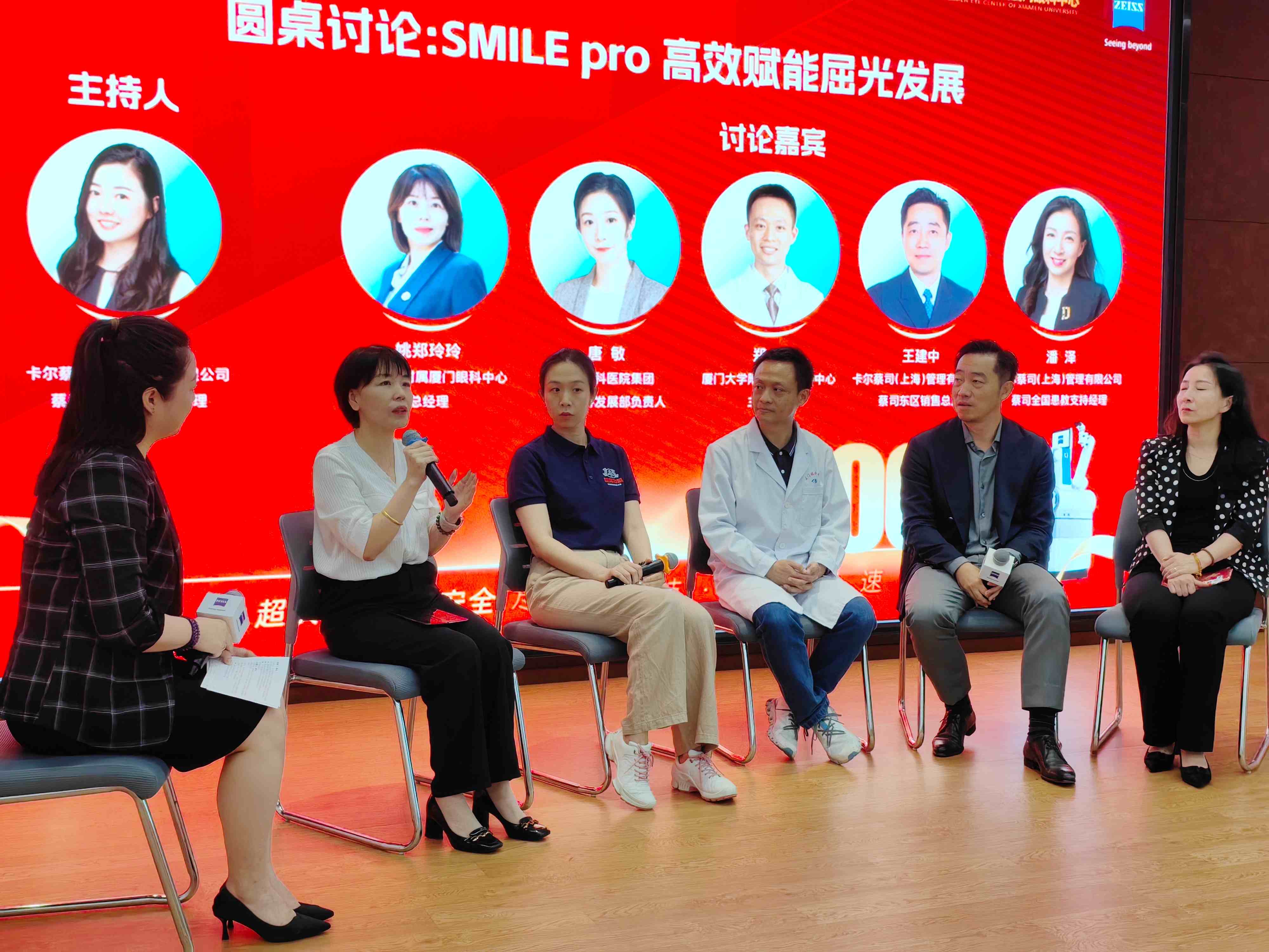 廈門眼科中心總經(jīng)理姚鄭玲玲、華廈眼科醫(yī)院集團(tuán)屈光學(xué)科發(fā)展部負(fù)責(zé)人唐敏、廈門眼科中心屈光科主任醫(yī)師鄭林、蔡司眼科大東區(qū)銷售總監(jiān)王建中、蔡司醫(yī)療屈光全國(guó)患教經(jīng)理潘澤等嘉賓,圍繞SMILE Pro技術(shù)在屈光領(lǐng)域的應(yīng)用現(xiàn)狀、未來(lái)發(fā)展、提升手術(shù)質(zhì)量與患者體驗(yàn)等議題展開(kāi)深度探討: