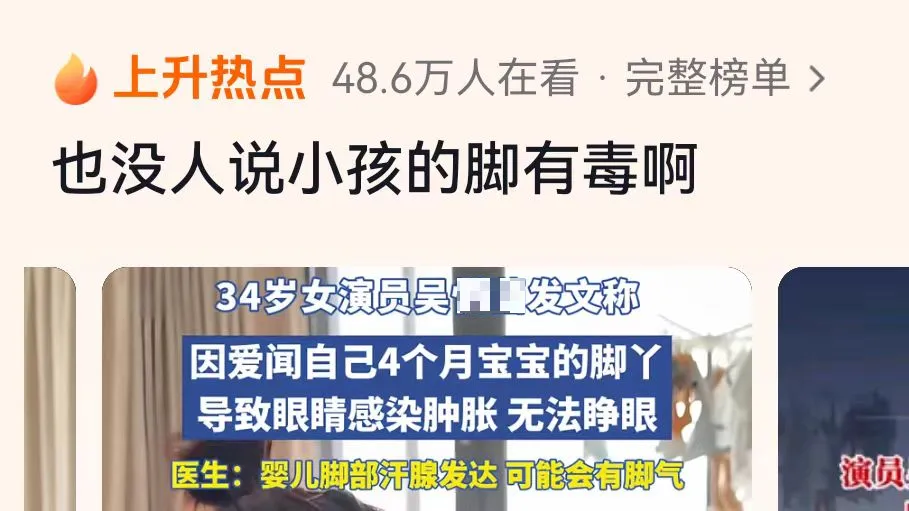 這兩天,一位34歲的女演員在社交平臺(tái)分享了一則自己的經(jīng)歷,她聞了自己四個(gè)月大的寶寶的腳丫后,眼睛竟然感染腫脹到睜不開。此消息一出,迅速登上熱搜,引發(fā)網(wǎng)友們熱議,該女演員也自嘲到:“也沒人跟我說小孩腳有毒啊。”